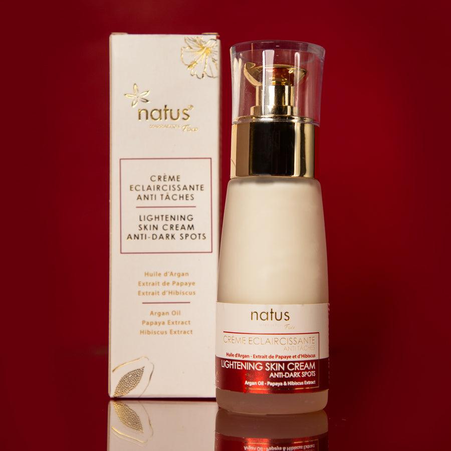 Redonnez éclat et homogénéité à votre teint grâce à la Crème Éclaircissante Anti-Taches Natus, un soin dépigmentant naturel formulé pour cibler les taches brunes, les irrégularités du teint et le manque d’éclat.